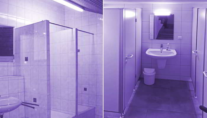 Das Badezimmer liegt im 3.OG der WG. Hier befinden sich die Duschen, Toilette und Waschbecken. Dort stehen auch Waschmaschine und Trockner zur Verfügung. Das Badezimmer ist recht groß und bietet dadurch die Möglichkeit Wäsche aufzuhängen. Sämtliche Handtücher, Reinigungsmittel und Putzutensilien sind ebenfalls dort vorhanden.